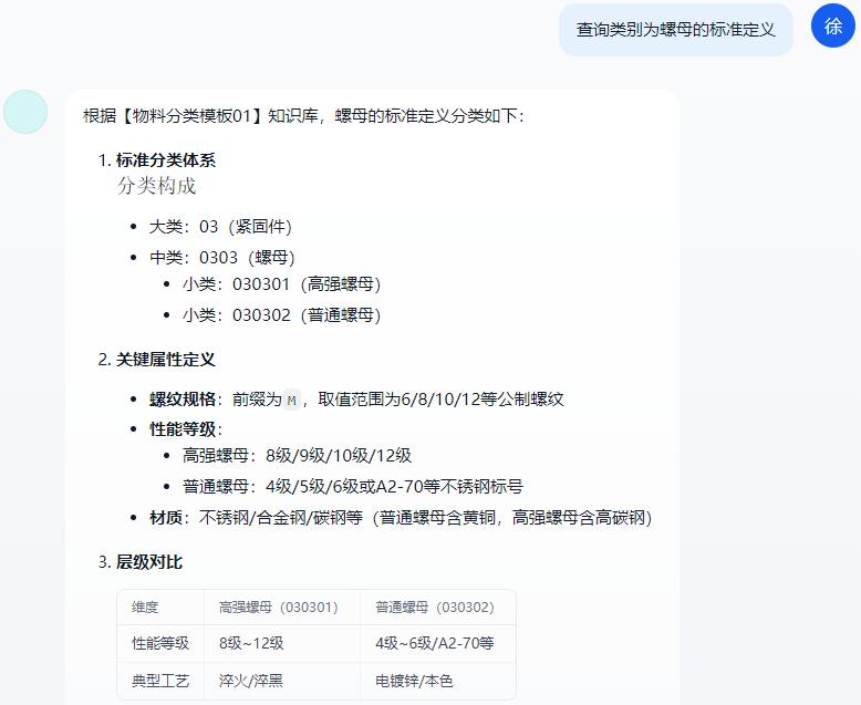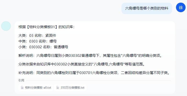 智能問答交互:用戶只需通過自然語言輸入問題(如“查詢類別為xxx的標準定義”、“根據(jù)物料長描述xxx推薦物料分類”),系統(tǒng)自動解析問題并精準匹配知識庫中的物料標準信息,無需復(fù)雜操作。