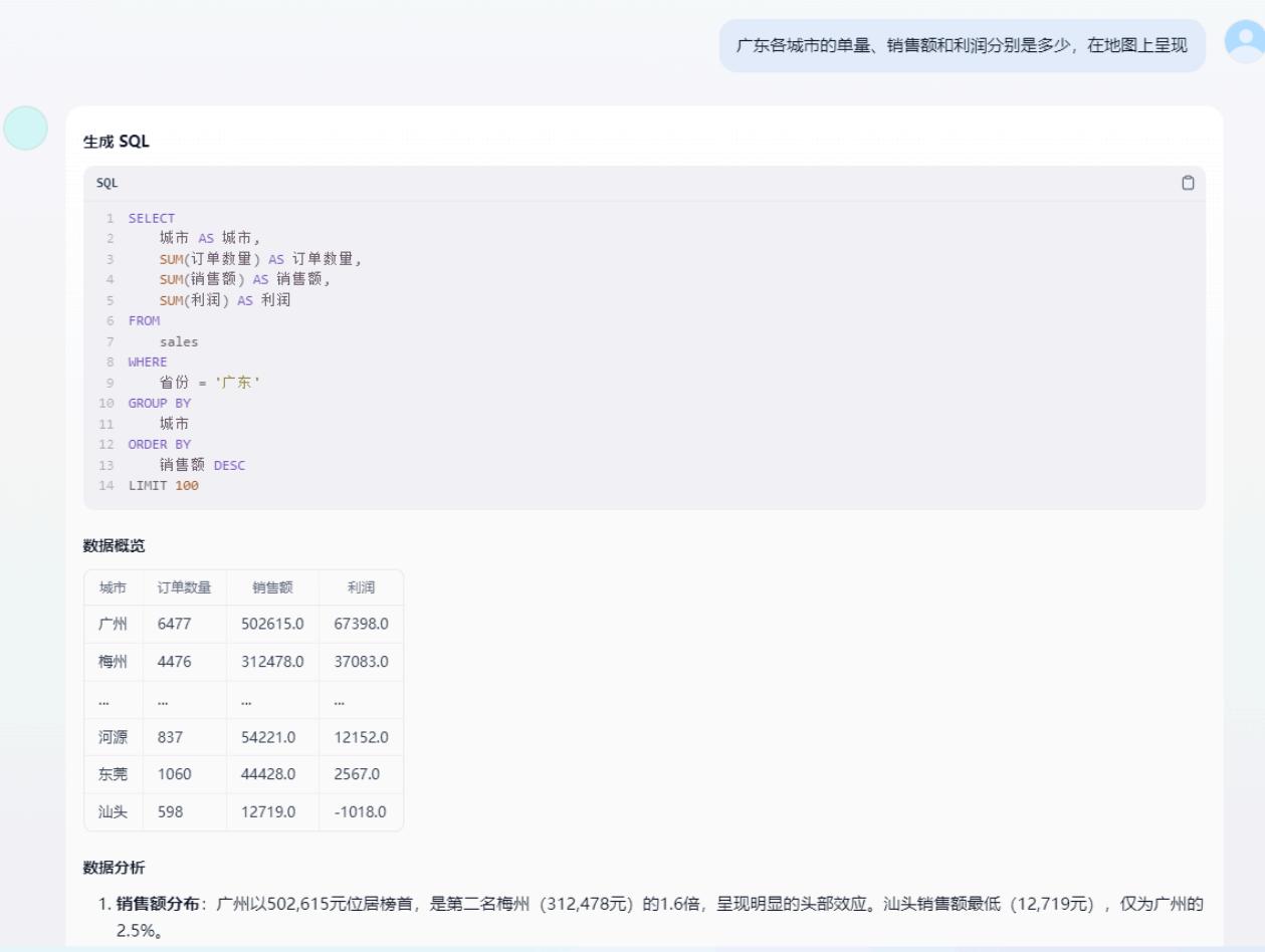 自然語言交互:通過對話式輸入(如 “對比Q3各區(qū)域銷售額” )自動生成分析邏輯,無需編寫代碼;