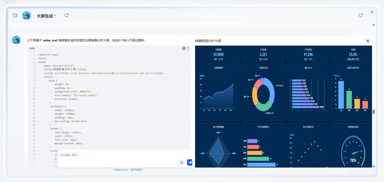 應(yīng)用于數(shù)據(jù)分析大屏智能體,可根據(jù)用戶(hù)問(wèn)題,調(diào)用數(shù)據(jù)計(jì)算分析工具,代碼生成工具,精準(zhǔn)生成完整的數(shù)據(jù)大屏應(yīng)用,大幅提升開(kāi)發(fā)效率,使數(shù)據(jù)可視化開(kāi)發(fā)更智能高效。