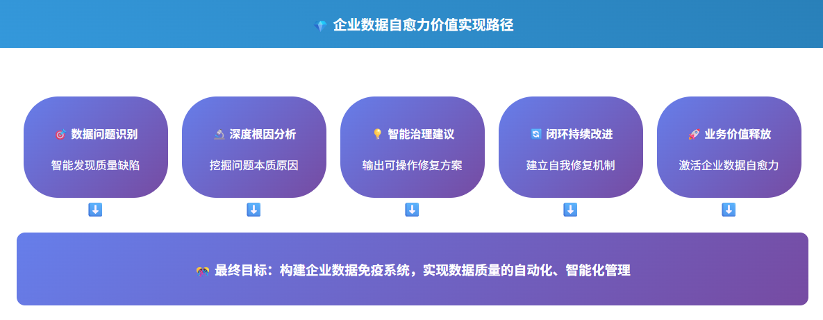 數(shù)據(jù)質(zhì)量智能體通過(guò)自然語(yǔ)言處理引擎解析報(bào)告中的復(fù)雜指標(biāo),將專業(yè)術(shù)語(yǔ)轉(zhuǎn)化為業(yè)務(wù)可讀性語(yǔ)言,自動(dòng)標(biāo)注關(guān)鍵異常點(diǎn)并關(guān)聯(lián)歷史趨勢(shì);結(jié)合知識(shí)庫(kù)中的業(yè)務(wù)場(chǎng)景模型,智能定位影響最大的質(zhì)量缺陷,通過(guò)可視化看板動(dòng)態(tài)推演問(wèn)題成因與業(yè)務(wù)影響路徑,最終輸出分級(jí)決策建議 —— 讓非技術(shù)角色也能秒懂?dāng)?shù)據(jù)健康度,驅(qū)動(dòng)精準(zhǔn)治理行動(dòng)。