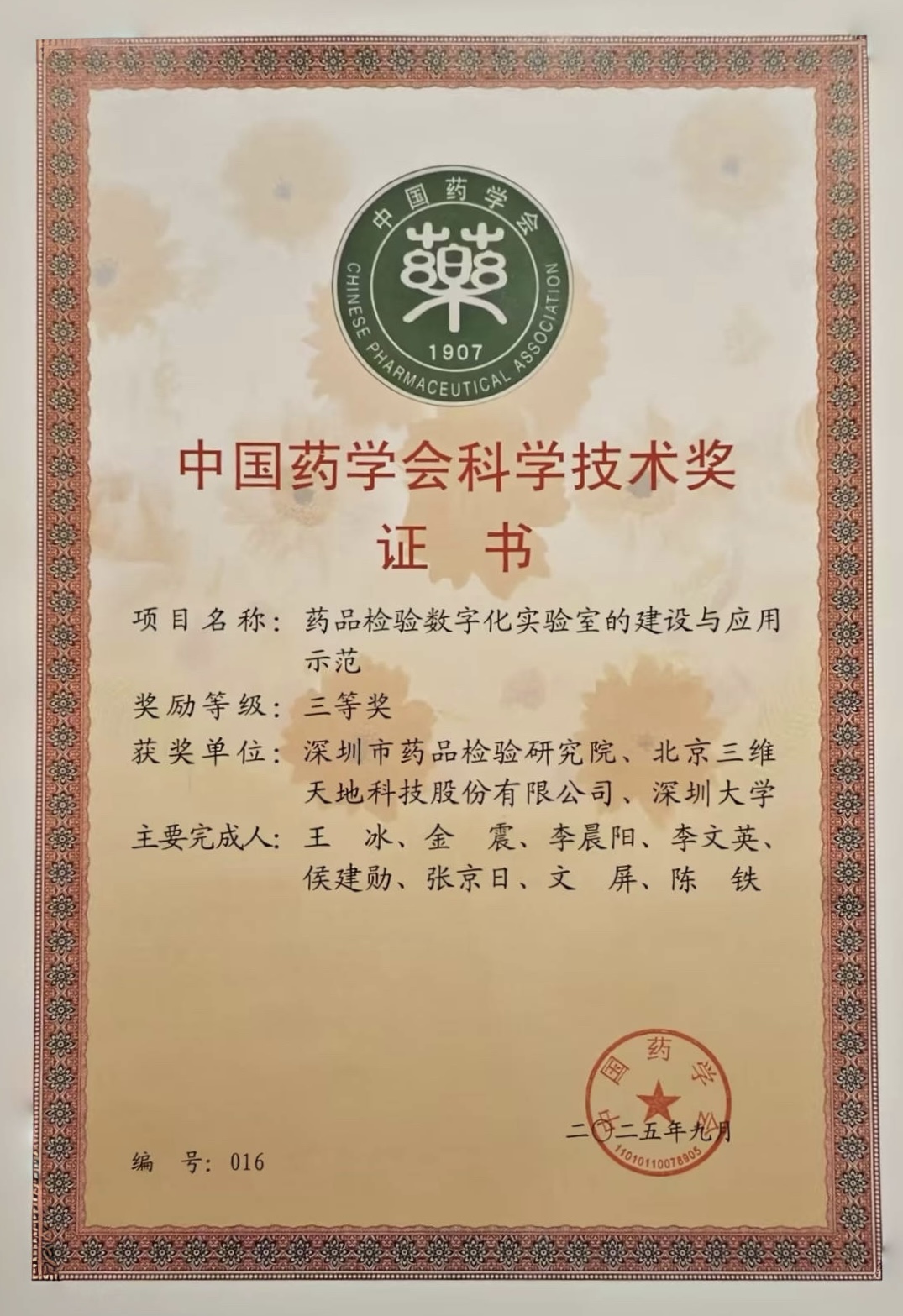 在近日成都盛大召開的2025年中國(guó)藥學(xué)大會(huì)上,一項(xiàng)標(biāo)志著我國(guó)藥品檢驗(yàn)數(shù)字化轉(zhuǎn)型里程碑的成果受到矚目。由深圳市藥品檢驗(yàn)研究院牽頭,聯(lián)合北京三維天地科技股份有限公司共同完成的“藥品檢驗(yàn)數(shù)字化實(shí)驗(yàn)室的建設(shè)與應(yīng)用示范”項(xiàng)目,憑借其顯著的技術(shù)創(chuàng)新性與行業(yè)示范價(jià)值,榮膺第二十屆中國(guó)藥學(xué)會(huì)科學(xué)技術(shù)獎(jiǎng)三等獎(jiǎng)。